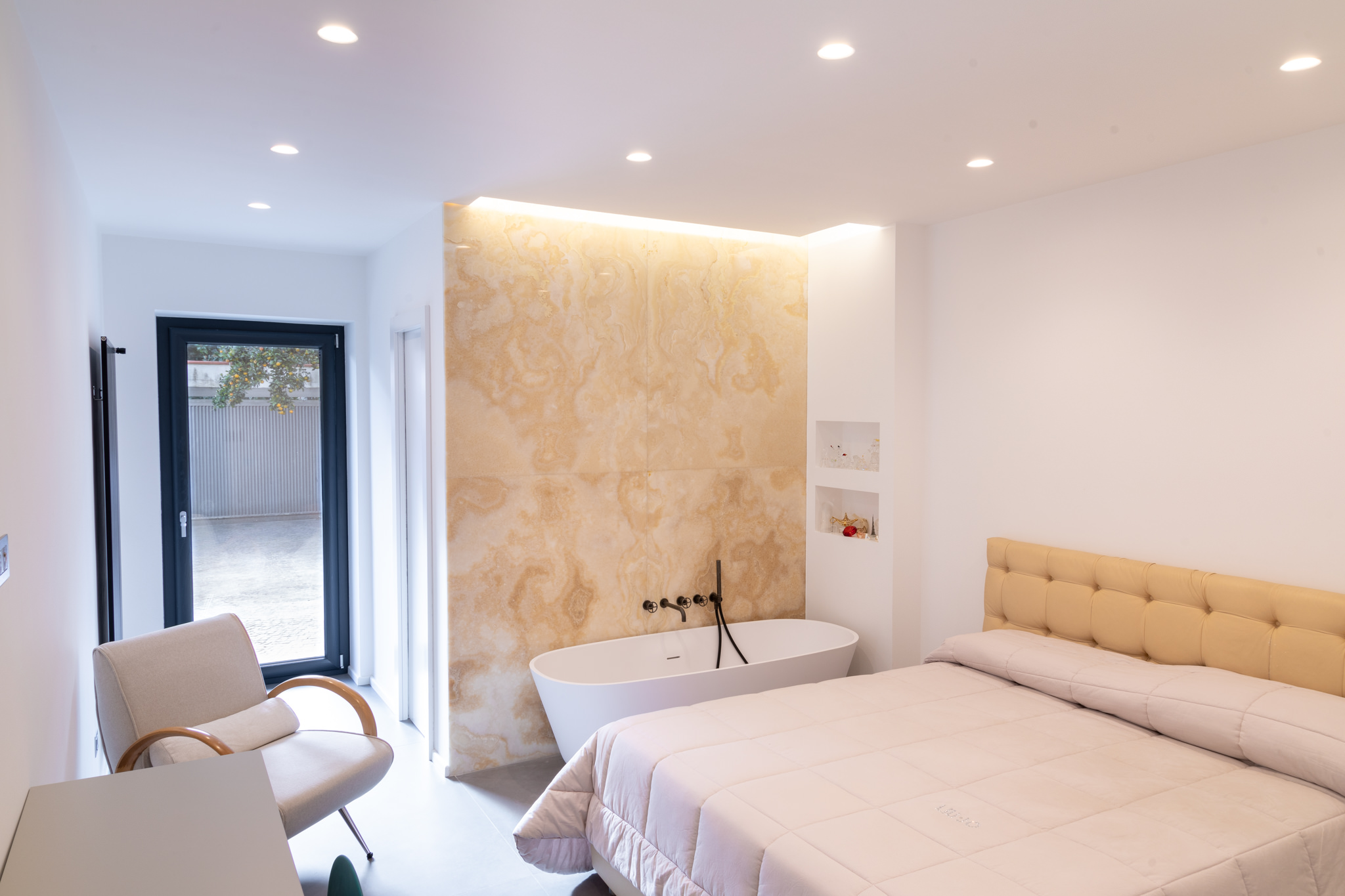 Un altro tema spesso sottovalutato è quello dell’umidità. Il bagno è progettato per gestirla, la camera da letto no. Inserire una vasca richiede quindi una strategia precisa: ventilazione adeguata (naturale o meccanica), materiali resistenti e, in alcuni casi, trattamenti specifici per pareti e pavimenti. Le superfici continue, come il gres o alcune resine, possono aiutare a contenere il problema, ma devono essere scelte e posate con criterio.